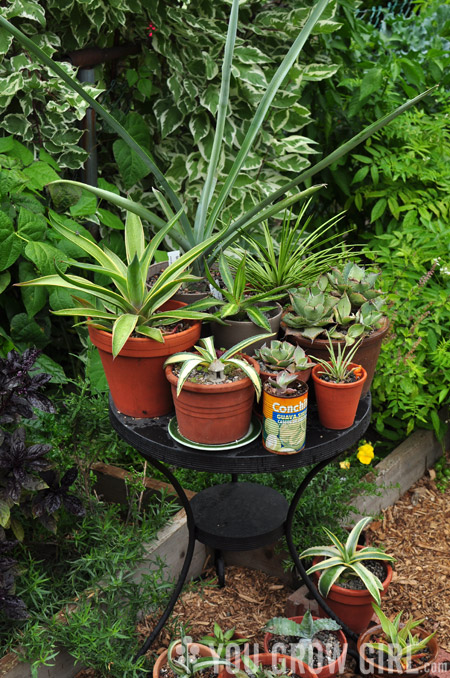 Taking a cue from Barry, a friend from whom I have stolen several good gardening ideas, I bought this $20 metal side table from Ikea over the summer with the purpose of using it to display some of my 16 agave plants (or is it 17? Someone make me stop.). For months I scoured the thrift stores for something used, hoping to find a table that would match Barry’s, a quality, heavy metal base with what may be a granite top. Luck was not on my side so I gave up and opted for Ikea.