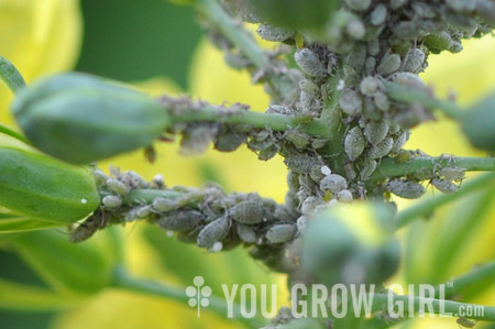 Were I not trying to save seed from these plants and if the TV crew were not going to be here next week to shoot a segment that involves these plants, I would simply cut them back hard and call it a day. I would wash the aphids off in soapy water in the sink and freeze the leaves for winter storage.