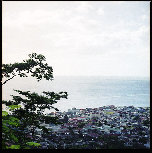 So far, I have approached each of these looking back trip posts without a plan. Sometimes I can recall exactly what occurred and I start writing straight away. Other times I go through the folders of digital and film photos taken that day and build a story around the images. Before looking at images, I remembered that day 7 (December 13, 2009) was when we left our hotel room in Roseau and headed back up to the little cottage on the hill in Morne Bruce, a suburb of sorts that overlooks the town. There wasn’t much to do that day since the cottage we had booked wasn’t ready for us. I recall that we did not want to go far because we expected to be called upon to move into the cottage at any moment. Well, it must have required deep cleaning because we spent the next 2 nights in the tiny jail-like room below it. In that time we stuck close by, exploring the property, and then venturing out a bit further to the top of the hill where there was an overlook of the city (I sometimes hesitate to write city here because Roseau’s population is only something like 7 thousand); down Jack’s Walk, a forest path that lead into the back portion of the botanical garden, and then back uphill to the cottage.