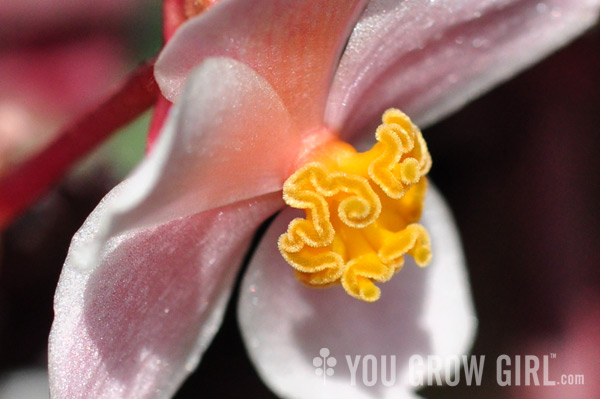 Begonia plants have male and female flowers that carry the reproductive organs on individual flowers. This flower is the female, aka pistillate flower. The yellow part in the center that looks like a twisted up pipe cleaner is called the stigma. It’s the part that receives the pollen. The entire female reproductive system is known as the pistal. In this photo, you can just see the ovaries peaking out from behind the flower.