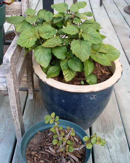 The good thing about patchouli is that if you cut it right back, it responds with lots of lush growth. So when I put them outside earlier this summer, I cut them right back. Soon small, new leaves appeared on the woody stems and now they are doing very well. They seem to like mostly sun, but will tolerate partial shade. They do well in the heat on my south-facing back deck.
