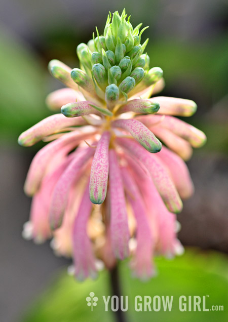 It took some time to search my subconscious, flipping through the hundreds, if not thousands of plants I had seen in a glance that afternoon. Finally it was the fuzzy, green leaf in the corner (top image) that provided the clue: Veltheimia, a flowering bulb from South Africa. I have one that I purchased cheaply at a plant sale 2 years ago — just this morning I had moved it to a warmer location in the house!