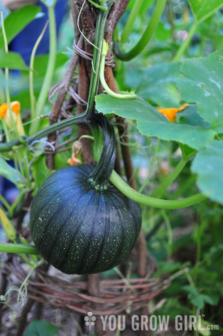 And so it grew and grew rather quickly as winter squashes often do. And when it was threatening to take over the yard, I brought over a freestanding trellis I had woven from green branches in the early spring and we wound it up and off of the ground.