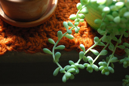 This windowsill warmer is easily crocheted much like coaster using double crochets and shell stitches as a decorative edge. Start by measuring the width and depth of your windowsill. Make chains until the width matches the width of your sill. Double crochet into each chain, making a turning chain at the end of the row (3 chains). Turn the piece around and continue double crocheting rows until your cozy is as deep as your windowsill. Shell stitch into one side to make a frilly edge that sits just over the front of the sill.
